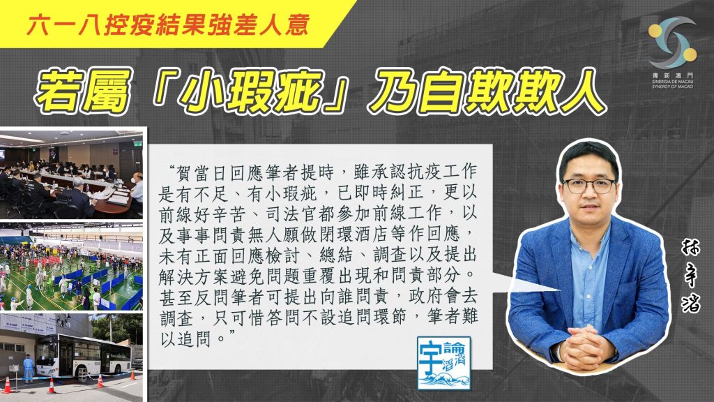 筆者雖同意,任何抗疫工作不可能完美,檢討、總結、調查和問責的目的,也絕非簡單找人孭鑊落台,更重要是查出問題,尋找解決方案和避免重覆犯錯。筆者必須指出,如果將六一八疫情強差人意的抗疫結果只歸結於小瑕疵,這是難以令受今波疫情影響嚴重的市民、商戶和社會各界所接受,甚至是一種自欺欺人的做法,相信日後社會自有公論,但關鍵是代表政府根本沒有全面檢討今波疫情的真正問題,避免在下波疫情再犯同樣的錯誤,再者避免重覆犯錯,也是賀上任之初自己提出的官員要求,不面對和檢討問題,如何避免重覆犯錯?
